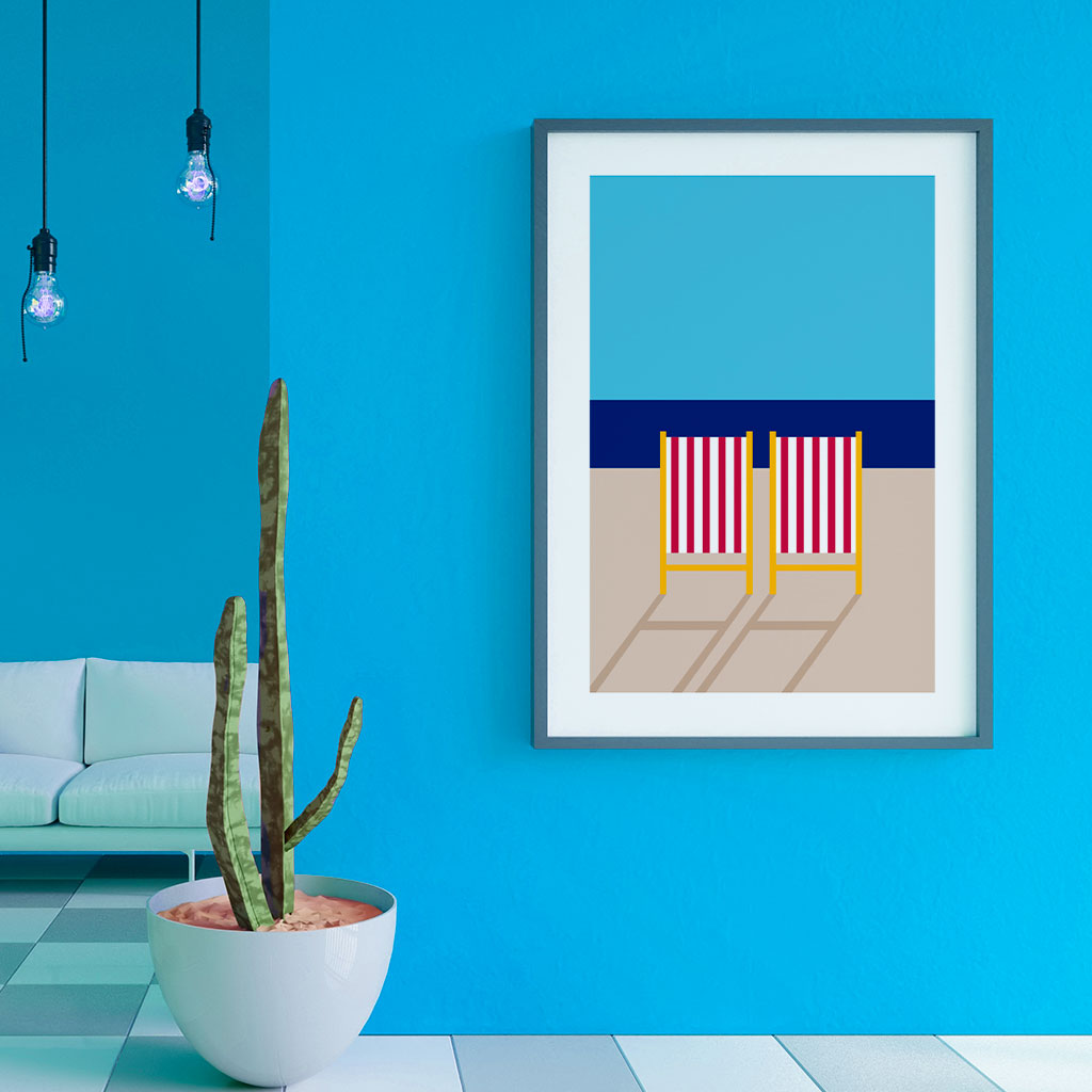 Minimalist illustration inspired by the beauty of nature in summer, a work that shows us a perfect landscape, blue sky, plastic-free sea, sand without garbage and fresh air. A flawless moment like this is at hand if we take care of the planet. A thought-provoking artwork meant to inspire.