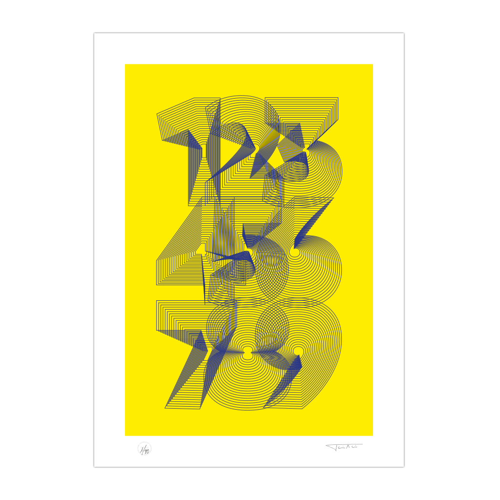 A typographic composition of numbers on a vibrant yellow background that captures timeless modernity, and the transformative and creative capacity of these elements. Created with an original typography designed by the artist, this artwork pays homage to design and typography.